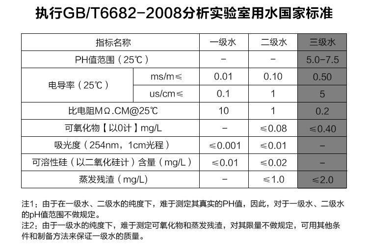 水质标准:电导率≤5μs/cm,@25℃,优于蒸馏水的标准,满足 GB/T6682-2008国家III级纯水标准