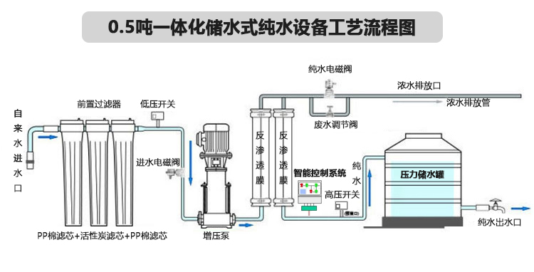 采用先进的低压反渗透技术,通过主机增压泵的压力驱动,把自来水输送至反渗透的膜系统中,反渗透膜运用自身的物理提纯技术,把自来水分离纯水,储存在储水桶。压力储水桶通过空气的压缩性、膨胀性原理,把储存在桶内的纯水压送到业主用水端。从而省去输送泵且达到输送的功能。节约成本,节省安装空间。当储水罐压力达到1.8bar时,设备停止运行停止制水,当储水罐压力低于0.8bar时,设备重新自动启动运行制水